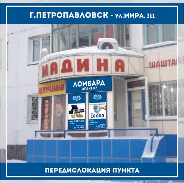 Уважаемые жители г.Петропавловск. Сообщаем вам о том, что с 1 февраля 2019 года, приемный пункт ломбарда по адресу: ул.Интернациональная, 74 переехал. Ждем вас по новому адресу: ул.Мира, 111. Приходите ежедневно с 9.00—21.00