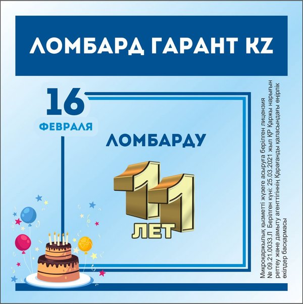 Сегодня нашему Ломбарду исполняется 11 лет! За эти годы мы смогли многого добиться и еще очень многое ждет нас впереди. А всем нашим клиентам хотим пожелать процветания и успеха! Благодарим за ваше доверие и за то, что все эти годы вы остаетесь рядом с нами! Ваш «Ломбард Гарант KZ»