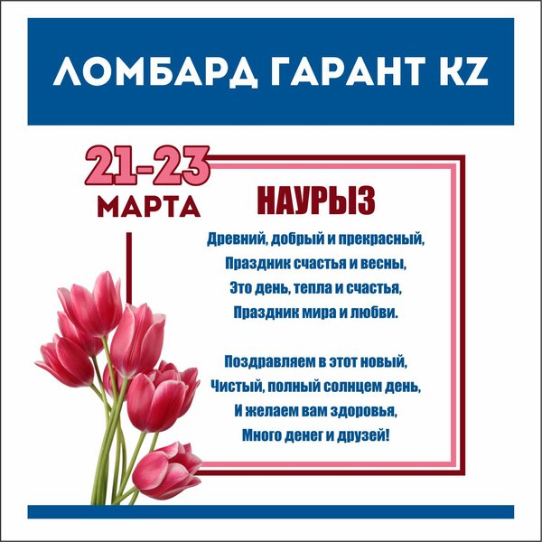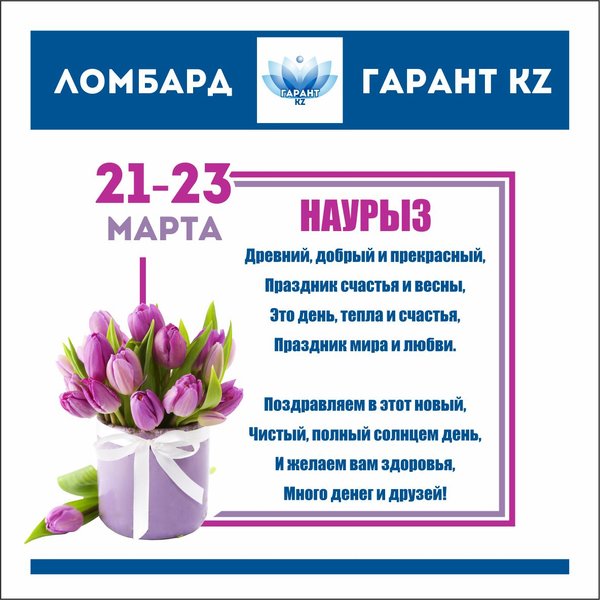 С праздником Наурыз! Дорогие друзья. Пускай светлый праздник Наурыз принесет в ваш дом много света, тепла, радости и уюта. Желаем, чтобы счастье и гармония переполняли ваши сердца, а жизнь была полна позитива, ярких красок и добра Пускай этой весной все ваши мечты и желания обязательно сбудутся. Все праздничные дни наши пункты работают БЕЗ ВЫХОДНЫХ, в прежнем режиме. Будем рады видеть всех постоянных и новых клиентов