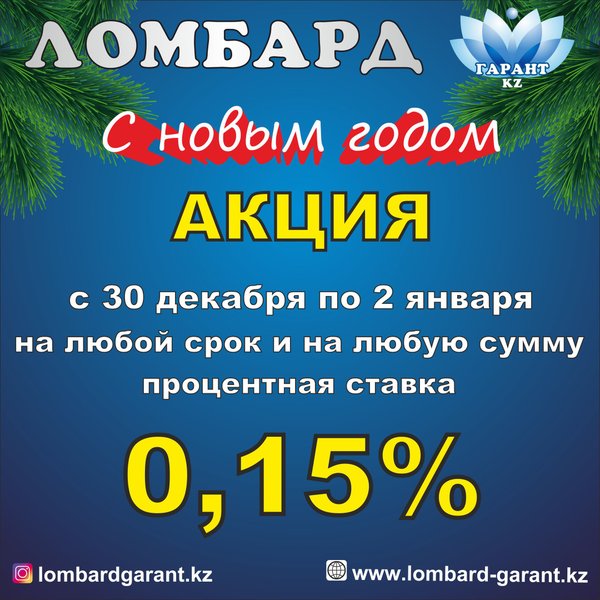 С наступающим Новым годом! Пусть этот год принесет вам только все самое лучшее, и всегда вам сопутствует удача, успех и везение. Здоровье будет крепким, счастье — настоящим, а настроение — только хорошим. Пусть вас всегда окружают любимые люди, и все, что загадано под бой курантов, обязательно сбудется! С уважением, ТОО «Ломбард Гарант KZ»